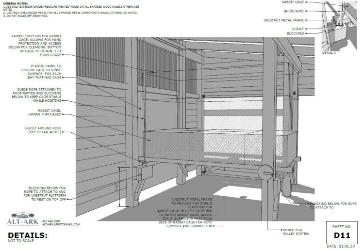 The owners wanted the ability to raise the rabbit cages from the ground. The cages could be lifted high up and close to the ceiling-here we added panels around the structure to act as wind breaks to protect the rabbits from the local breeze which felt like they could be harsher in the winter.