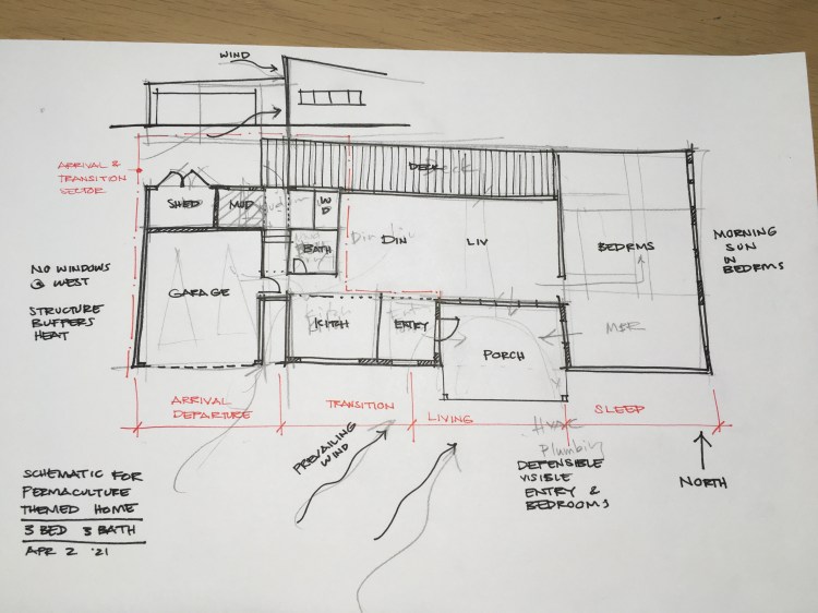 I’m sharing a schematic floor plan for a house I was working on, designed with permaculture in mind. I imagined this to be a site built home on a rural property. I hit pause on this idea after getting stuck on a problem which I now don’t recall.