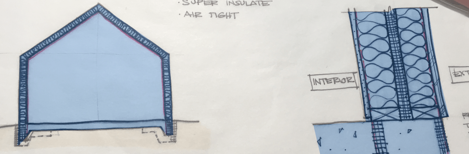A home designed with permaculture principles needs to be honest and true to it’s resources. The facade in this sketch mirrors a deeper indoor living space on the north end, and the south end has a shallower interior space but has a deeper shade from the outdoor porch.
